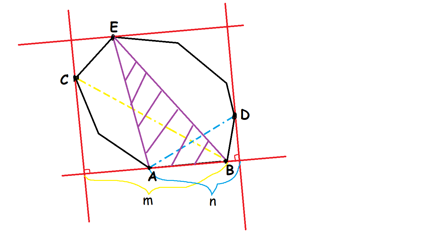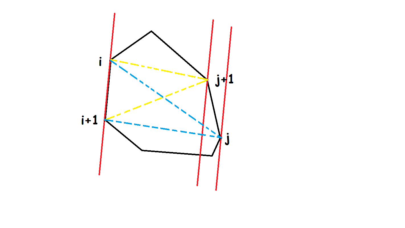 枚举过程中,对于每条边,都检查 \(j+1\) 和边 \((i,i+1)\) 的距离是不是比 \(j\) 更大,如果是就将 \(j\) 加一,否则说明 \(j\) 是此边的最优点。判断点到边的距离大小时可以用叉积分别算出两个三角形的面积(如图,黄、蓝两个同底三角形的面积)并直接比较。