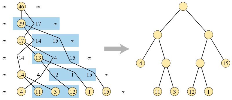 如上图所示,在算法的第一阶段,通过查找合并输入序列的无序三元组构建的二叉树(左侧),和算法输出的正确排序的二叉树,其中叶子高度与另一棵树一样。