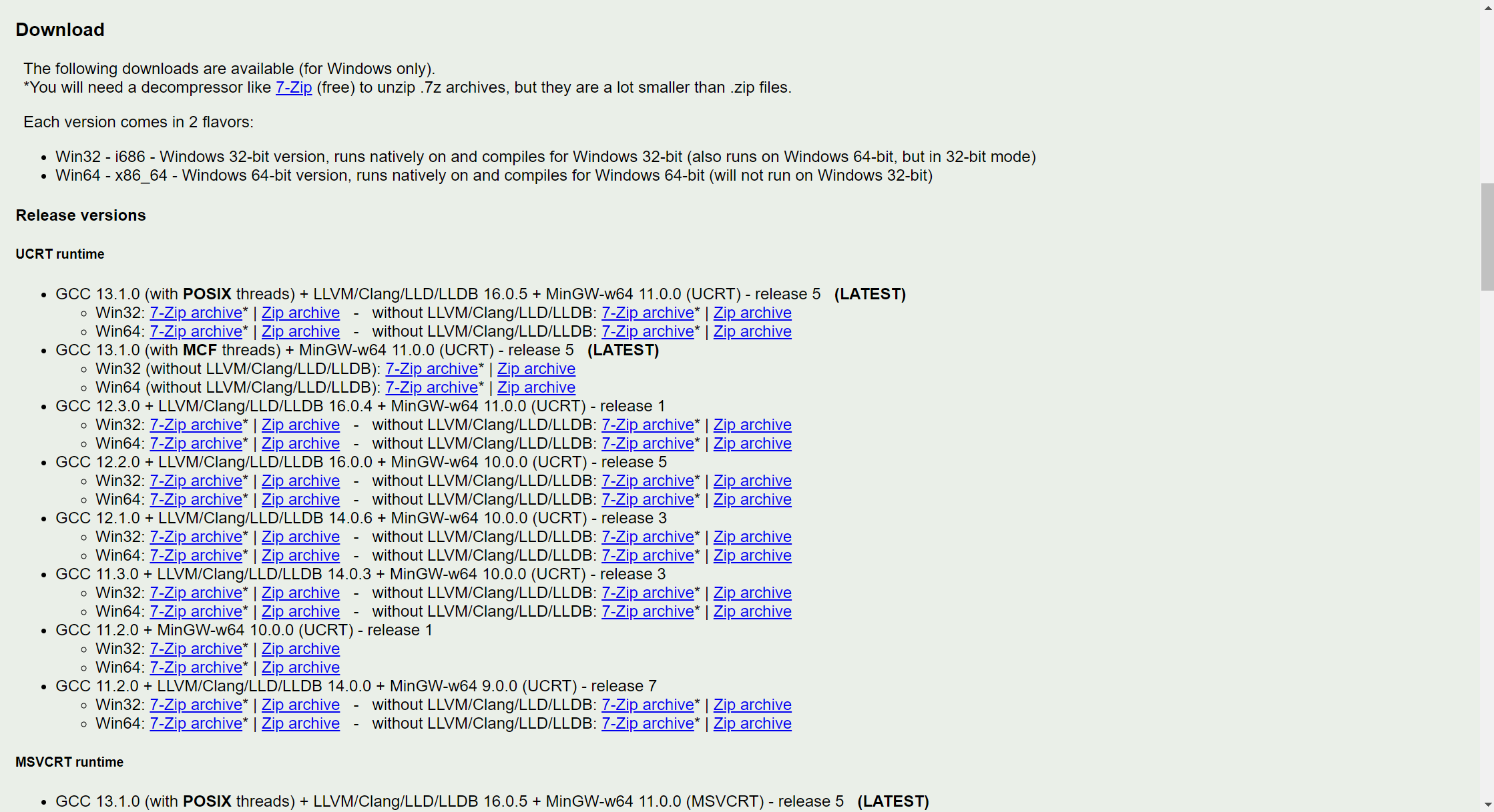 访问 MinGW-w64 的下载页面,有多个构建版本。方便起见,我们使用由 WinLibs 提供的构建版本。