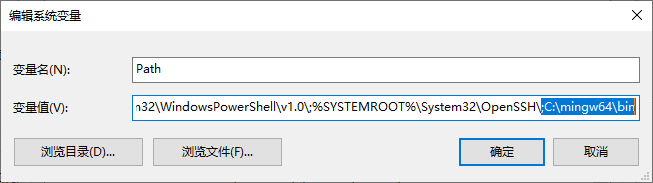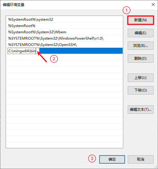 在编辑窗口中点击右侧的「新建」按钮,为「Path」变量新建一个条目,并填入上文中记录下的可执行文件所在的目录(教程中为 C:\mingw64\bin